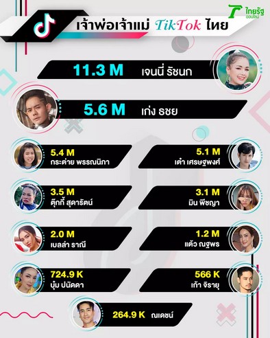 ใครยอดฟอลโลว์ติ๊กต๊อก TikTok เยอะสุด รีบไปดูกันเลย เริ่มกันที่ 1 เป็นนักร้องสาว เจนนี่ รัชนก สุวรรณเกตุ janeydm ยอดคนตามมากถึง 11.3 ล้านคน