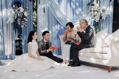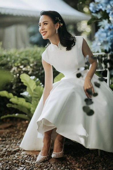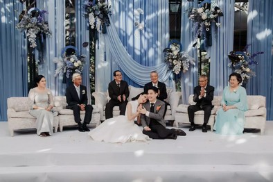โดยในช่วงเช้าถือฤกษ์งามยามดีจัดขบวนขันหมากสู่ขอเจ้าสาว โดยเจ้าบ่าวมาในชุดสูทสีเทา พร้อมด้วยญาติผู้ใหญ่และเพื่อนๆ ร่วมฝ่าประตูเงิน ประตูทอง ไปพบเจ้าสาว ซึ่ง รถเมล์ มาในชุดสีขาวที่ดูเรียบแต่หรูสุดๆ จากแบรนด์ POEM ในสไตล์จีนที่มีความโมเดิร์น สวยสง่า จากนั้นเข้าสู่พิธีสวมแหวนหมั้นและพิธียกน้ำชา