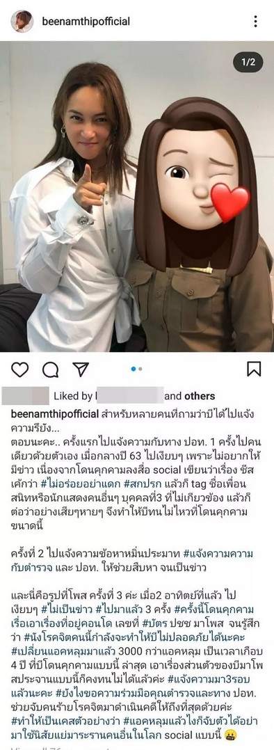 ล่าสุด เอาเรื่องส่วนตัวของบีมาโพสประจานแบบนี้ก็คงทนไม่ได้แล้วค่ะ #แจ้งความมา3รอบแล้วนะคะ #ยังไงขอความร่วมมือคุณตำรวจและทาง ปอท. ช่วยจับคนร้ายโรคจิตมาดำเนินคดีให้ถึงที่สุดด้วยค่ะ #ทำให้เป็นเคสตัวอย่างว่า #แอคหลุมแล้วไงก็จับตัวได้อย่ามาใช้นิสัยแย่มาระรานคนอื่นในโลก social แบบนี้"