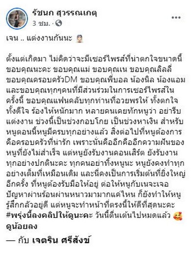 ต้องบอกว่าเป็นเรื่องราวดีๆ ของนักร้องลูกทุ่งคนดัง เจนนี่ รัชนก หรือ เจนนี่ ได้หมดถ้าสดชื่น ที่เจ้าตัวได้โชว์ภาพแหวนเพชรวงงามบนนิ้วนางข้างซ้าย พร้อมกับระบุว่าถูกเซอร์ไพรส์ขอแต่งงานจาก เนเงิน แฟนหนุ่มที่คบกันมากว่า 4 ปี โดยได้เผยความรู้สึกถึงการถูกขอแต่งงานว่า