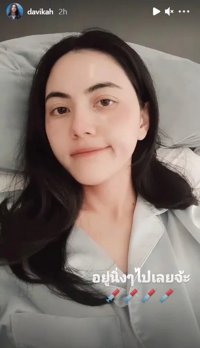 ล่าสุดเธอก็ได้มาลงสตอรี่ใหม่เมื่อช่วงบ่ายอีกที เป็นรูปตัวเธอที่นอนพักอยู่ พร้อมกับแคปชั่นว่า “อยู่นิ่งๆ ไปเลยจ้ะ” พร้อมกับอีโมจิรูปเข็มฉีดยา ยังไงทางเราก็ต้องขอส่งกำลังใจให้สาวใหม่หายไวๆ นะจ๊ะ จะได้มาเป็นดาวิที่สดใสเหมือนเดิมได้อย่างรวดเร็ว