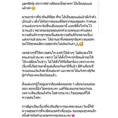 " ตั้งแต่แรกผู้ใหญ่อยากถือเคล็ดรอครบ 3 เดือนก่อนค่อยบอก ตอนนี้ยังไม่ครบนะคะ แต่ก็ต้องออกมาบอกก่อน เพราะเห็นเขียนถึงกันไปต่างๆนานา ก็ขอบคุณที่ให้ความสนใจค่ะ ” การมีลูกเป็นเรื่องที่น่ายินดีมากๆ ของหยาดและวันนี้ก็มีความสุขมากๆ ที่จะมีครอบครัวที่อบอุ่น ขอบคุณทุกคนอีกครั้งสำหรับคำอวยพรจากทุกคนนะคะ ”
