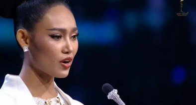 มิสแกรนด์ สหรัฐอเมริกา Miss Abena Appiah อัลเบน่า แอพเพีย พูดภาษาอังกฤษสั้นๆ คมๆ ตบท้ายด้วยภาษาไทยชัดๆ ไปว่า "พวกเราต้องการสันติภาพ"