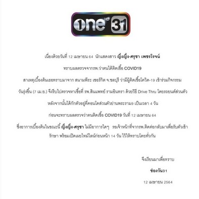 วันที่ 12 เมษายน 2564 ช่องวัน 31 ออกประกาศ ระบุว่า ญิ๋งญิ๋ง-ศรุชา เพชรโรจน์ ทราบผลตรวจจากรพ.ว่าได้ติดเชื้อ COVID19 โดยสาเหตุเบื้องต้น สาเหตุเบื้องต้นทราบมาจากสนามพีระ เซอร์กิต จ.ชลบุรี ว่ามีผู้ติดเชื้อโควิด-19 เข้าร่วมกิจกรรม