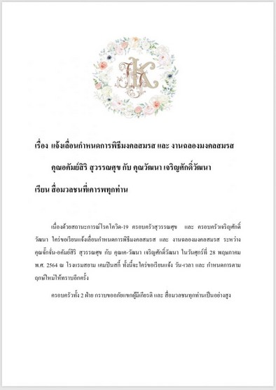 อีกทั้งครอบครัวของทั้งสองฝ่ายยังได้ถือโอกาสนี้กล่าวขออภัยแขกผู้มีเกียรติและสื่อมวลชนเป็นอย่างสูง พร้อมกับระบุว่าหากทราบกำหนดการใหม่เมื่อไหร่ ก็จะรีบนำมาแจ้งให้ทุกคนได้ทราบอีกครั้งในภายหลัง