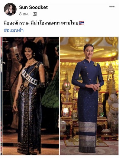 โดย คุณสรรค์ สุดเกตุ ผู้ออกแบบและเจ้าของแบรนด์วนัชกูตูร์ ยังยอมรับว่า ชุดไทยสีน้ำเงินเข้มที่เขาออกแบบให้อแมนด้าสวมใส่ เป็น “สีของจักรวาล” สีนำโชคของนางงามไทย พร้อมโพสต์รูปคุณ ปุ๋ย ภรณ์ทิพย์ นาคหิรัญกนก อดีตนางงามจักรวาลคนที่สองของไทย ที่สวมใส่ชุดไทยสีน้ำเงินเข้ม ขึ้นประกวดบนเวทีนางงามจักรวาล จนคว้ามงสอง มาให้ชาวไทยและแฟนนางงามในอดีตได้สมหวังและปลาบปลื้มกันมาแล้ว