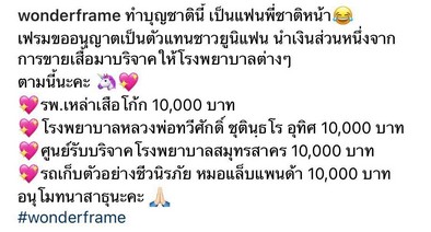 โดย เฟรม วันเดอร์เฟรม เผยว่า “เฟรมขออนุญาตเป็นตัวแทนชาวยูนิแฟน นำเงินส่วนหนึ่งจากการขายเสื้อมาบริจาคให้โรงพยาบาลต่างๆ ตามนี้นะคะ