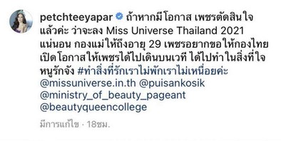 "ถ้าหากมีโอกาส เพชรตัดสินใจแล้วค่ะ ว่าจะลง Miss Universe Thailand 2021 แน่นอน กองแม่ให้ถึงอายุ 29 เพชรอยากขอให้กองไทยเปิดโอกาสให้เพชรได้ไปเดินบนเวที ได้ไปทำในสิ่งที่ใจหนูรักจัง #ทำสิ่งที่รักเราไม่พักเราไม่เหนื่อยค่ะ"