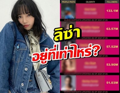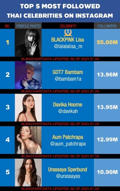 โดยลิซ่า ยังครองอันดับ 1 คนดังที่มีผู้ติดตามสูงที่สุดในไทย และ เกาหลีใต้ และเป็นอันดับที 6 ของคนดังเอเชียด้วย โดยยอดผู้ติดตามขณะ 55,010,281 ฟอลโล่วเวอร์ #ลิซ่า#blackping#ลิซ่าblackping
