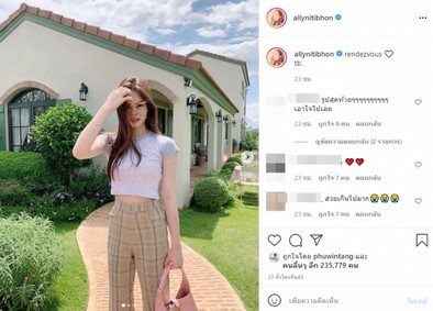 ล่าสุดในอินสตราแกรมของน้องแอลลี่ เจ้าตัวได้โพสต์ภาพของตัวเองในลุคที่สวยสะกดตา โดยน้องเเอลลี่อยู่ในชุดกางเกงลสยสก็อต เสื้อสีเทาขนาดพอดีกับตัว สวมรองเท้าสีฟ้า เป็นลุคที่สบายๆเเต่เรื่องความสวยคือปังมาก