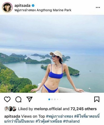 โดย ไอซ์ อภิษฎา ได้โพสต์รูปตัวเองในชุดบิกินีสีน้ำเงินตัวจิ๋ว พร้อมกับอวดความงามของวิวท้องทะเลที่หมู่เกาะอ่างทอง ก่อนแปะแคปชั่นว่า “Views on Top #หมู่เกาะอ่างทอง #ดีใจที่มาตอนนี้แก่กว่านี้ไม่ปีนละนะ #วิวคุ้มค่าเหนื่อย #thailand”