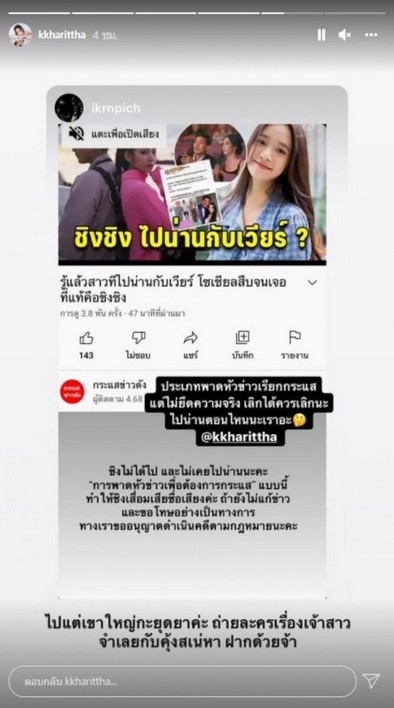 โดยเพจดังกล่าวมีการพาดหัวว่า“รู้แล้วสาวที่ไปน่านกับเวียร์ โซเชียลสืบจนเจอที่แท้คือชิงชิง” ซึ่งงานนี้แน่นอนว่าสาวเจ้าไม่ทนนิ่งเฉย รีบออกมาโพสต์สตอี่ไอจีชี้แจงเรื่องดังกล่าวว่าไม่เป็นความจริง ด้วยภาพข่าวดังกล่าวพร้อมข้อความชี้แจงว่า..