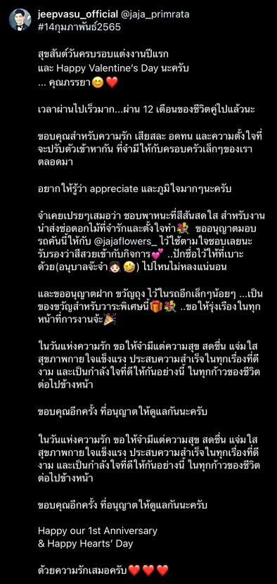 “เวลาผ่านไปเร็วมาก ผ่าน 12 เดือนของชีวิตคู่ไปแล้วนะ ขอบคุณสำหรับความรัก เสียสละ อดทน และความตั้งใจที่จะปรับตัวเข้าหากัน ที่จ๋ามีให้กับครอบครัวเล็กๆ ของเราตลอดมา อยากให้รู้ว่า appreciate และภูมิใจมากๆ นะครับ จ๋าเคยเปรยๆ เสมอว่า ชอบพาหนะที่สีสันสดใส สำหรับงานนำส่งช่อดอกไม้ที่จ๋ารักและตั้งใจทำขออนุญาตมอบรถคันนี้ให้กับ @jajaflowers ไว้ใช้ตามใจชอบเลยนะ รับรองว่าสีสวยเข้ากับกิจการ ปักชื่อไว้ให้ที่เบาะด้วย (อนุบาลจ๊ะจ๋า) ไปไหนไม่หลงแน่นอน