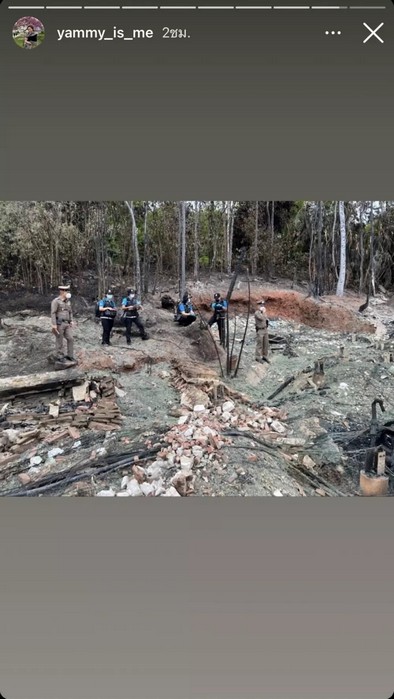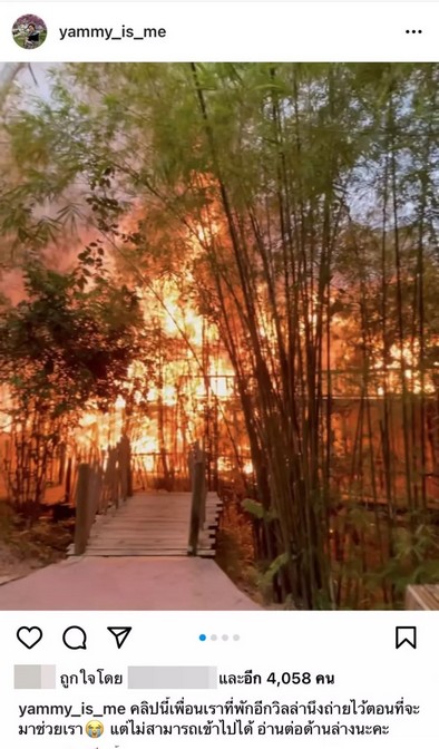 โดย แยม ได้โพสต์คลิปที่ไฟกำลังลุกโชนอย่างหนัก พร้อมเขียนเล่าเหตุการณ์ที่เกิดขึ้นว่า "คลิปนี้เพื่อนเราที่พักอีกวิลล่านึงถ่ายไว้ตอนที่จะมาช่วยเรา แต่ไม่สามารถเข้าไปได้ อ่านต่อด้านล่างนะคะ"
