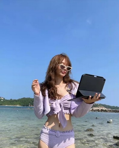 แต่ภาพล่าสุดที่นางเอกสาวร่างเล็กโพสต์ลงทำเอาไอจีแทบลุกเป็นไฟเลยทีเดียว เมื่อเจ้าตัวใส่บิกินีสีม่วงพาสเทลตัวจิ๋ว ที่ท่อนบนมีเสื้อคลุมทับดูเป็นทางการนิดๆ แต่ท่อนล่างคือทำหนุ่มๆ หัวใจหล่นไปถึงตาตุ่ม พร้อมกับแคปชั่นน่ารักๆ ว่า "มาทะเลแต่ติดประชุม"