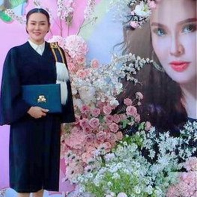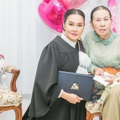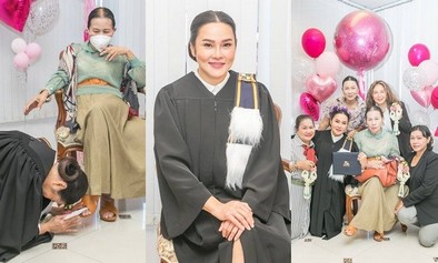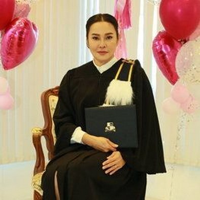 "ปริญญาศิลปศาสตรมหาบัณฑิตกิตติมศักดิ์ Honorary Master of Arts (Performing Arts) คณะอุตสาหกรรมสร้างสรรค์ศิลปะการเเสดง มหาวิทยาลัยรัตนบัณฑิต(RBAC) ขอบคุณ รองศาตราจารย์ ดร.สุรินทร์ เมทนี..นับว่าเป็นอีกนาทีที่ยิ่งใหญ่เป็นเกียรติประวัติกับชีวิต และครอบครัวใหม่ที่สุดค่ะ