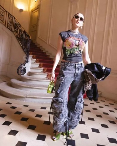 ประเดิมลุคนี้ด้วยเสื้อครอปปักคริสตัลลายดอกไม้ แมตช์กับ กางเกงยีนส์ทรงโอเวอร์ไซส์ และรองเท้า กระเป๋า จาก MIU MIU แบรนด์แฟชั่นสัญชาติอิตาเลียน