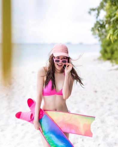 มาต่อด้วยลุคนี้ สวมเป็นชุดบิกินีสีชมพูหวาน บวกกับแว่นกันแดดสีชมพู แมทช์กับหมวกสีชมพู ให้โลกนี้กลายเป็นสีชมพู พร้อมยิ้มกระชากใจส่งสายตาไปหนึ่งแมทช์ บอกเลยว่าหวานฉ่ำน้ำตาลขึ้นทั้งหาด