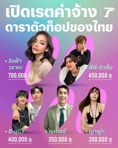 ปิดท้ายที่ อิงฟ้า วราหะ รองอันดับ 1 มิสแกรนด์อินเตอร์เนชันแนล 2022 ที่นาทีนี้ไม่มีใครฮอตเท่ากับเธอแล้ว เพราะตอนนี้อิงฟ้าได้จับจองครองแทบจะทุกอีเวนต์ไปเรียบร้อยแล้ว เรียกว่าค่าตัวทำงานต่อ 1 ชั่วโมงสูงพุ่งทะยานแซงหน้านางเอกรุ่นพี่ไปเรียบร้อย ด้วยเรตค่าตัวอยู่ที่ 700,000 บาท