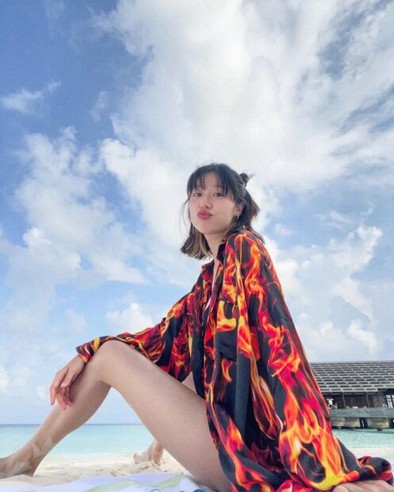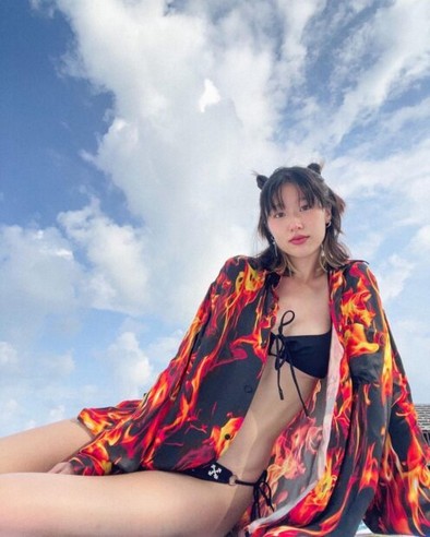 ว้าวๆ ร้อนฉ่าผ้าเดือดมาแต่ไกล ใส่บิกินีสีดำตัวจิ๋ว แต่ที่ไม่จิ๋วคือเสื้อคลุมลายไฟ ลุคนี้ทำทะเลไฟลุกซู่กันเลยทีเดียว แถมยังอวดหุ่นเห็นความแซ่บเพรียวไม่น้อยหน้าเลยจริงๆ