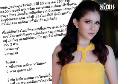 แอนนี่ บรู๊ค ได้โพสต์อินสตาแกรม ระบุว่า “ในวันจันทร์ที่ 30 มกราคม 2566 เวลา 09:00 น. แอนนี่ บรู๊ค พร้อม ทนายเจมส์ จะเดินทางไปขึ้นศาลอาญา รัชดา เป็นครั้งแรก สืบเนื่องจากมีเพจและคนคอมเมนต์ที่ขึ้นรูปน้องและพูดพาดพิงถึงน้องในแง่ไม่ดี ซึ่งน้องยังเป็นเยาวชน ทำให้เกิดความเสียหายทั้งชื่อเสียงและจิตใจ เรื่องนี้เป็นเรื่องใหญ่ที่ทางแอนนี่และทนายเจมส์เห็นตรงกันว่าควรให้ความสำคัญเพราะเป็นเรื่องของลูกและเด็กยังเป็นเยาวชนอยู่ และในฐานะแม่ที่ต้องปกป้องลูก จึงจำเป็นเดินหน้าฟ้อง อัดแน่น 2 ศาล 1. ศาลอาญา 2. ศาลแพ่ง...
