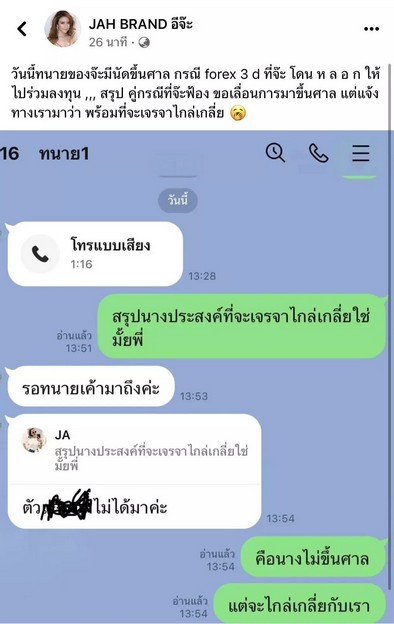 โดยระบุข้อความว่า "วันนี้ทนายของจ๊ะมีนัดขึ้นศาล กรณี forex 3 d ที่จ๊ะ โดน ห ล อ ก ให้ไปร่วมลงทุน ,,, สรุป คู่กรณีที่จ๊ะฟ้อง ขอเลื่อนการมาขึ้นศาล แต่แจ้งทางเรามาว่า พร้อมที่จะเจรจาไกล่เกลี่ย"