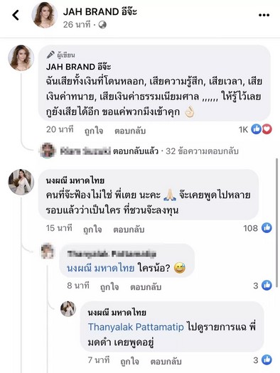 ก่อนที่จะให้รายละเอียดเพิ่มเติมใต้โพสต์ดังกล่าวว่า "ฉันเสียทั้งเงินที่โดนหลอก, เสียความรู้สึก, เสียเวลา, เสียเงินค่าทนาย, เสียเงินค่าธรรมเนียมศาล ,,,,,, ให้รู้ไว้เลย กูยังเสียได้อีก ขอแค่พวกมึงเข้าคุก"