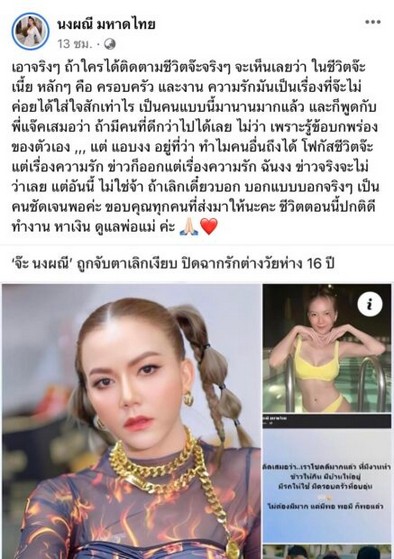 งานนี้ "สาวจ๊ะ" ไม่ปล่อยผ่าน ได้โพสต์ถึงประเด็นดังกล่าวผ่านเพจเฟซบุ๊กส่วนตัวว่า "เอาจริงๆ ถ้าใครได้ติดตามชีวิตจ๊ะจริงๆ จะเห็นเลยว่า ในชีวิตจ๊ะเนี้ย หลักๆ คือ ครอบครัว และงาน ความรักมันเป็นเรื่องที่จ๊ะไม่ค่อยได้ใส่ใจสักเท่าไร เป็นคนแบบนี้มานานมากแล้ว และก็พูดกับพี่แจ๊คเสมอว่า ถ้ามีคนที่ดีกว่าไปได้เลย ไม่ว่า เพราะรู้ ข้อบกพร่องของตัวเอง ,,, แต่ แอบงง อยู่ที่ว่า ทำไมคนอื่นถึงได้ โฟกัสชีวิตจ๊ะแต่เรื่องความรัก ข่าวก็ออกแต่เรื่องความรัก ฉันงง ข่าวจริงจะไม่ว่าเลย แต่อันนี้ ไม่ใช่จ้า ถ้าเลิกเดี๋ยวบอก บอกแบบบอกจริงๆ เป็นคนชัดเจนพอค่ะ ขอบคุณทุกคนที่ส่งมาให้นะคะ ชีวิตตอนนี้ปกติดี ทำงาน หาเงิน ดูแลพ่อแม่ ค่ะ"