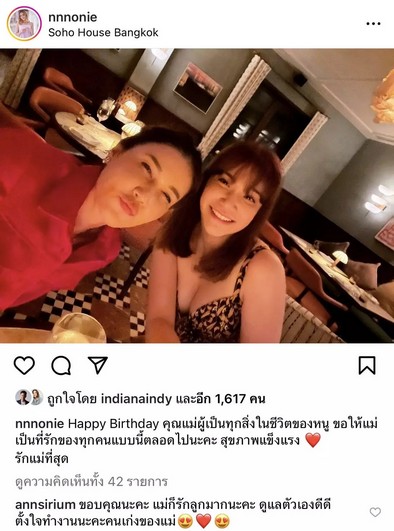 และจากโพสต์ดังกล่าวนี้เองทางด้าน แอน สิเรียม ก็ได้เข้ามาตอบกลับความรักของลูกสาวผ่านช่องคอมเมนต์ด้วยเช่นกัน "ขอบคุณนะคะ แม่ก็รักลูกมากนะคะ ดูแลตัวเองดีดี ตั้งใจทำงานนะคะ คนเก่งของแม่"
