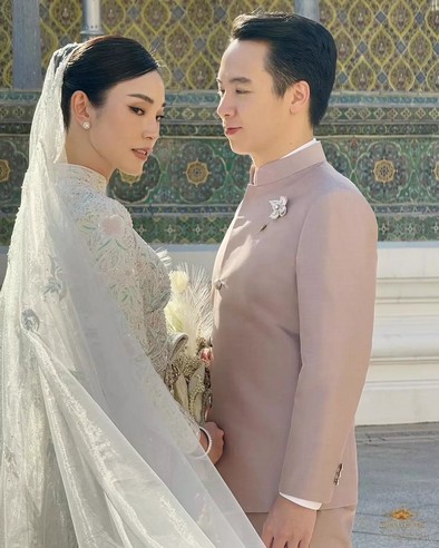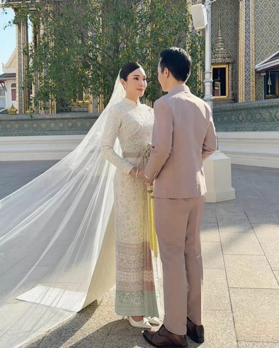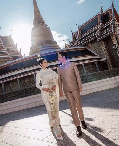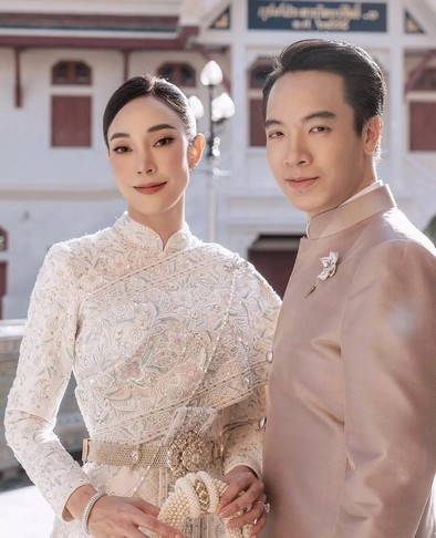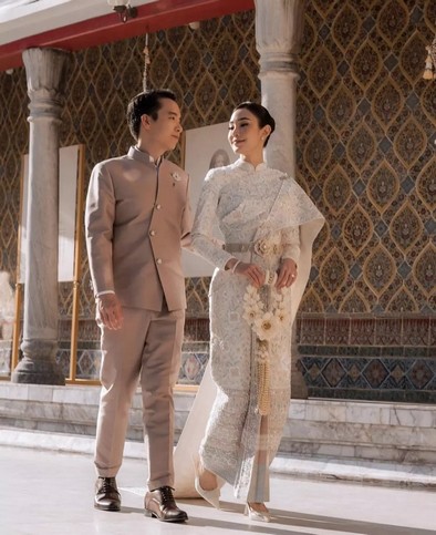 โดย สาวเมย์ เลือกใช้ชุดไทยศิวาลัยสีขาวมุก ที่ได้ร่วมออกแบบกับทาง ห้องเสื้อ วนัช กูตูร์ ซึ่งเป็นชุดที่ว่าที่เจ้าสาวบอกว่า เป็นชุดไทยที่สะท้อนความเป็นตัวตนของ เมย์ 100%