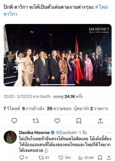 โดยในภาพดังกล่าว แอนโทเนีย ยืนตรงกลาง ส่วน ใหม่ ดาวิกา ยืนริม ซึ่งมีผู้ใช้ X รายหนึ่งได้โพสต์ว่า “ปกติ ดาวิกาจะได้เป็นตัวเด่นตามงานต่างๆ นะ #ใหม่ดาวิกา”