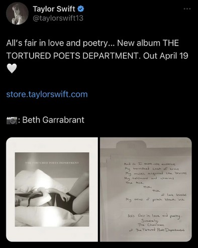 ทันทีที่ลงเวที เทย์เลอร์ได้โพสต์ภาพอัลบั้มใหม่ตามที่บอกไว้ในช่วงท้ายของสปีช ซึ่งภาพดังกล่าว มาพร้อมเนื้อเพลง "And so I enter into evidence / My tarnished coat of arms / My muses, acquired like bruises / My talismans and charms / The tick, tick, tick, of love bombs, my veins of pitch black ink." All's fair in love and poetry "The Chairman of the Tortured Poets Department"."