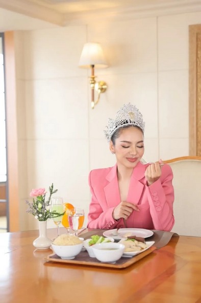 ในห้องสวีทสุดหรู “King Suit" บนชั้น ๒๔ ณ มณเฑียร ริเวอร์ไซต์ โฮเทล แบ็งค็อก พร้อมด้วย มงกุฎสายใยผูกพัน , คฑาวชิราวุธ , สายสะพายประจำตำแหน่ง , ช่อดอกไม้จาก FlowDesign , และอาหารเช้าเซ็ทใหญ่มื้อแรก ที่เสิร์ฟพร้อมข้าวไก่ เมนูชื่อดังของโรงแรม