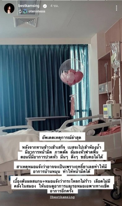 ตอนนี้มีอาการปวดหัว มึนๆ ตึงๆ ขยับคอไม่ได้ สาเหตุหมอแจ้งว่าอาจจะเป็นเพราะฤทธิ์ยาเลยทำให้มีอาการบ้านหมุน ทำให้หน้ามืดได้ เบื้องต้น ผลสแกน + หมอแจ้งว่า กะโหลกไม่ร้าว เลือดไม่มีคลั่งในสมอง ให้นอนดูอาการ และรอหมอเฉพาะทางเช็กอาการอีกครั้ง"