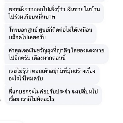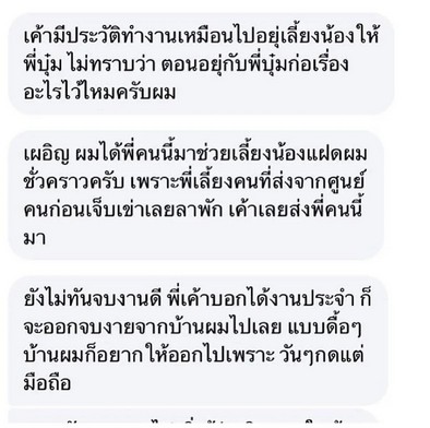 แต่เปล่าเลยค่ะ บุ๋มได้รับการติดต่อจากคุณหมอท่านหนึ่ง ดั่งข้อความที่เห็น บุ๋มรู้สึกเสียใจมากที่ให้โอกาสพี่เค้า และรู้สึกเสียใจกับอีกบ้านนึงที่พี่เค้าเอาชื่อบุ๋มไปแอบอ้างเพื่อการหางานกับศูนย์พี่เลี้ยงที่ใหม่ พร้อมกับชื่อใหม่ แล้วไปขโมยเงินเค้าแบบนี้ คุณหมอบอกว่าที่ยอมรับพี่เลี้ยงคนนี้เพราะเห็นว่าเคยเลี้ยงลูกบ้าน คุณบุ๋ม