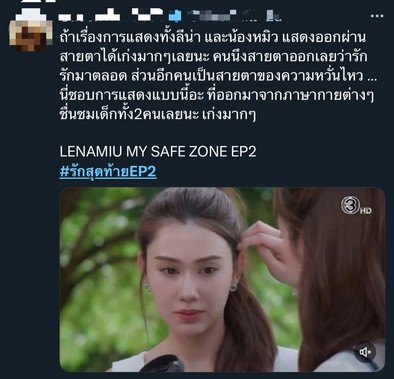 แรงไม่หยุดจริง ๆ สำหรับซีรีส์ “รักสุดท้าย My Safe Zone The Series” ทางช่อง 3 ออกอากาศไปได้เพียงแค่สองตอนแต่กระแสตอบรับดีเกินคาด ทำเอาแฟน ๆ อินหนักจนพาติดเทรนด์ X ชั่วข้ามคืน กับเคมีความน่ารักละมุนน่าหยิกของ “ลีน่า ลลินา” และ “หมิว ณัชชา” พายอดดูสดออนไลน์ทาง 3Plus พุ่งทะลุสูงถึง 136K