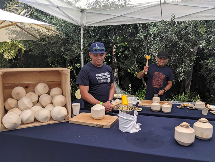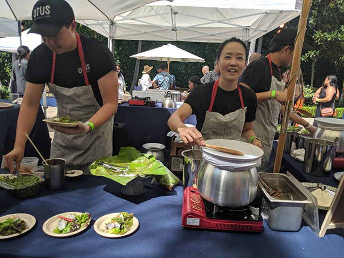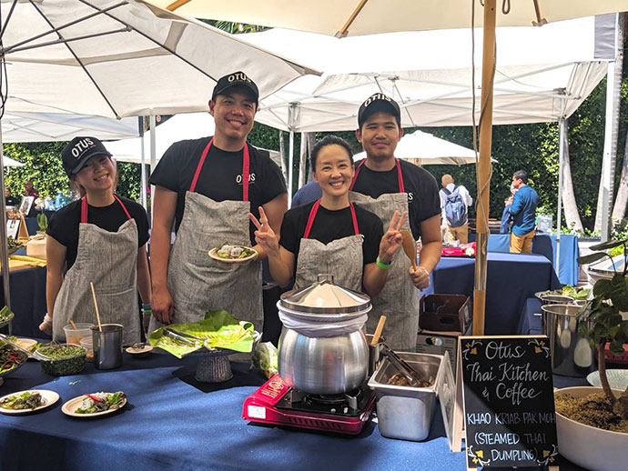 เชฟ “จูน” จากร้าน Otus Thai Kitchen & Coffee กล่าวว่าเธอเป็นคนทางเหนือ เกิดที่พะเยา เคยอ่านประวัติของ “สตู” ที่ได้ช่วยเหลือเด็กชาวเขามาเป็นเวลานาน ปีนี้เป็นปีแรกที่ได้ร่วมงาน โดยในวันนี้ได้นำเอาอาหาร “ข้าวเกรียบปากหม้อ” มาโชว์ และอยากจะฝากถึงชาวแอลเอให้เข้ามาลองอาหารเช้าทั้งในแบบไทยและเทศ รวมทั้งกาแฟหอมกรุ่นที่ชงกันสด ๆ ที่ร้านของเธอได้ตั้งแต่ 9 โมงเช้าทุกวัน