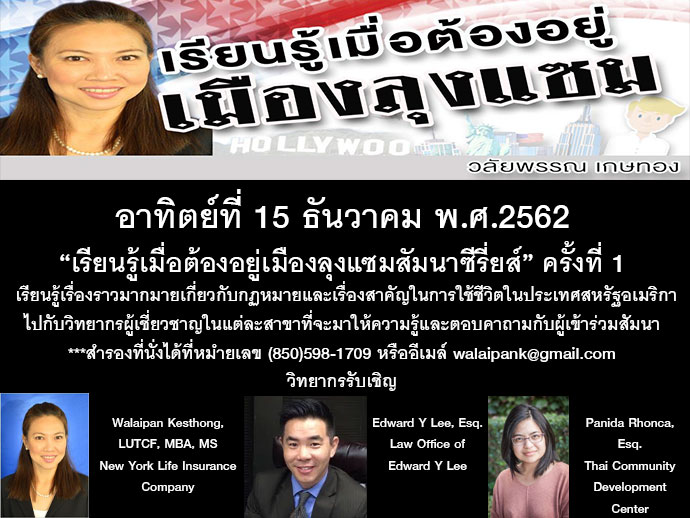 ก่อนจากไปอยากจะฝากข่าวประชาสัมพันธ์ว่าวันอาทิตย์ที 15 ธันวาคมที่จะถึงนี้ จะมีสัมนาให้ความรู้กับชุมขนไทยในเรื่องของระบบประกันสังคม กฏหมายอุบัติภัย และเรื่องของการสมัครเป็นพลเมืองอเมริกัน โดยทนายเอ๊ดเวิร์ด ลี และ ทนายพนิดา รอนสะ จากศูนย์ส่งเสริมชาวไทย รวมทั้งผู้เขียน จะมาบรรยายให้ความรู้ในแต่ละด้าน ตั้งแต่เวลา 13.00-15.00 น. ณ วัดป่าธรรมชาติ เมืองลาพวนเต้ หากใครสนใจจะเข้าร่วมฟังสัมนาขอให้แจ้งการลงทะเบียนมาที่ วลัยพรรณ เกษทอง หมายเลข 850-598-1709 หรือส่งอีเมล์มาที่ walaipank@gmail.com ได้ตั้งแต่วันนี้เป็นต้นไปค่ะ