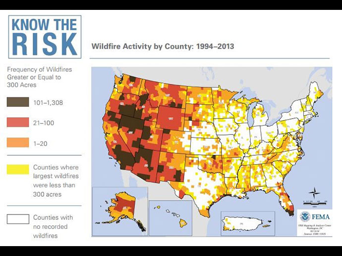 ไฟป่าสามารถเกิดขึ้นได้บ่อยจากการกระทำของมนุษย์หรือการจุดไฟ ซึ่งทำให้เกิดน้ำท่วม ทำให้การเดินทางและสาธารณูปโภคและการสื่อสารหยุดชะงัก สามารถเกิดขึ้นที่ไหนก็ได้เมื่อไหร่ก็ได้ ซึ่งความเสี่ยงในการเกิดไฟป่าจะเพิ่มมากขึ้นในช่วงที่มีฝนตกน้อยและลมแรง ในแต่ละปีไฟป่าทำความเสียหายให้กับรัฐบาลกลางของสหรัฐหลายพันล้านเหรียญ