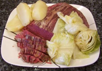 นอกจากเบียร์สีเขียวสัญญลักษณ์ของวันเซ้นท์แพ็ททริคแล้ว ยังมีความนิยมที่จะรับประทาน “คอร์นด์บีฟ” ซึ่งเป็นเนื้อเค็มชนิดหนึ่ง ส่วนมากจะทำจากเนื้อวัวส่วนที่เรียกว่า Brisket ซึ่งเป็นส่วนอกของวัวซึ่งอยู่ใต้ซี่โครง นำมาต้มทั้งก้อนกับเกลือและเครื่องเทศต้มนานๆทั้งวัน เมื่อเสร็จแล้วก็รับประทานกับผักกะหล่ำปลี