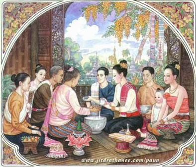 คนที่อยู่ไกลบ้านอย่างคนแอลเอ เวลาสงกรานต์ก็มักจะเศร้าหงอยเหงา นึกถึงบรรยากาศสนุกสนานในช่วงสงกรานต์ที่ได้อยู่กันพร้อมหน้าพร้อมตากับครอบครัว ได้อ่านเฟสบุ๊คของน้องคนหนึ่งที่ตอนนี้อยู่ที่ชิคาโก เธอเขียนว่า “อยากรดนํ้าดําหัวคุณพ่อคุณแม่คุณย่าคุณยายญาติผู้ใหญ่” เป็นวลีโพสท์ขึ้นมาเปรยๆทำนองจะบ่นๆตามประสาเฟสบุ๊ค ผู้เขียนนั้นสะดุดตรงคำว่า อยากรดน้ำดำหัวคุณพ่อ เพราะปรกติเรามักจะไม่พูดว่าดำหัว ด้วยความที่เป็นคนไทย ดำหัวคุณพ่อคุณแม่ นั้นฟังดูแปลกๆ อย่างมากเราก็จะใช้คำพูดว่า “รดน้ำ” เฉยๆไม่ใช้คำว่าดำหัว