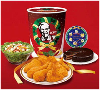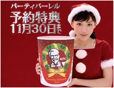เทศกาลคริสต์มาสในประเทศญี่ปุ่นหมายถึงสิ่งเดียวเท่านั้น ไก่ทอด KFC เริ่มต้นมาจากที่ชาวอเมริกาในประเทศญี่ปุ่นที่ต้องการฉลองวันคริสมาสไม่ สามารถหาซื้อไก่ทั้งตัวได้ เพราะที่ญี่ปุ่นไม่นิยมขายไก่ทั้งตัวกัน ดังนั้น ชาวต่างชาติเหล่านี้จึงต้องมาลงเอยที่การซื้อไก่ KFC ไปกินแทนเพราะน่าจะใกล้เคียงกับที่หาได้มากที่สุดแล้ว