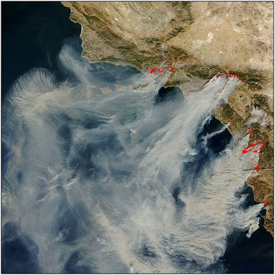 ไฟป่าเป็นภัยพิบัติอย่างหนึ่งที่เกิดขึ้นได้ง่ายเขตร้อน ควันและขี้เถ้าจากเหตุการณ์ไฟไหม้ป่าที่เกิดขึ้นอย่างรุนแรงสามารถลอยขึ้น สู่ท้องฟ้าได้นับร้อยไมล์ จนนักบินอวกาศสามารถบอกได้ว่าเกิดอะไรขึ้น จากภาพตัวอย่าง เป็นภาพไฟป่าในรัฐแคลิฟอร์เนีย เมื่อเดือนตุลาคมปี 2003 เคราะห์ซ้ำกรรมซัดเจอพายุซาตาอาน่า (Santa Ana) เข้าไปอีก ไฟป่าจึงลามอย่างรวดเร็วกินพื้นที่ 10,000 เอเคอร์ในเวลาเพียง 6 ชั่วโมง