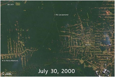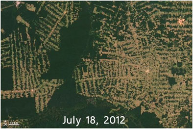 ภาพถ่ายดาวเทียมที่หยิบมาให้ดูนั้น เป็นภาพจากดาวเทียม Landsat 1 ของนาซ่า ถ่ายจากผืนป่าอเมซอน เก็บข้อมูลมาตั้งแต่ปี 2000 จนถึง 2012 ค่ะ ผ่านไป 12 ปี ปรากฏว่าเนื้อที่ป่าที่เคยเขียมชอุ่ม หายไปกว่า 2,500 ตารางกิโลเมตร เท่านั้นไม่พอ ถ้าย้อนไปในช่วงปี 1980 นับมาจนถึงปัจจุบัน พื้นที่ป่าอเมซอนหายไปแล้วกว่า 360,000 ตารางกิโลเมตร