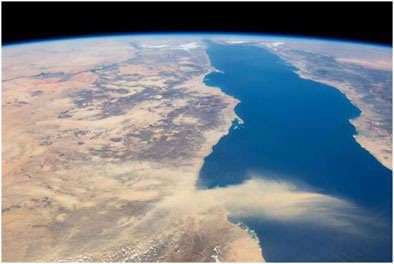 การมองเห็นพายุทรายจากสถานีอวกาศนานาชาติจะทำให้เห็นได้ชัดเจนยิ่งขึ้นว่า พายุขนาดใหญ่ขนาดไหน ยกตัวอย่างเช่นภาพนี้ เป็นภาพพายุทรายขนาดใหญ่จากประเทศอียิปต์ที่กำลังพัดผ่านทะเลแดง