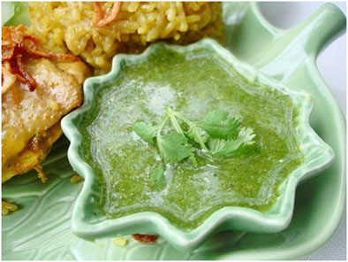 หลายคนเรียกน้ำจิ้มชนิดว่า น้ำจิ้มข้าวหมกไก่กันจนติดปาก และอาจจะนึกไปว่าทำมาจากพริกขี้หนูเขียวผสมกับใบโหระพาหรือผักชี แต่จริง ๆ แล้วเป็นน้ำจิ้มที่ผสมใบสะระแหน่ เลยทำให้น้ำจิ้มข้าวหมกไก่มีกลิ่นหอมเย็น ๆ ซึ่งสูตรนี้เป็นสูตรมาจาก คุณบ่งบ๊ง ที่นำเสนอไว้ในวิธีทำข้าวหมกไก่ แถมน้ำจิ้มข้าวหมกไก่สูตรนี้ยังสามารถนำไปกินกับก๋วยเตี๋ยวลุยสวนได้อีกด้วย นะคะ