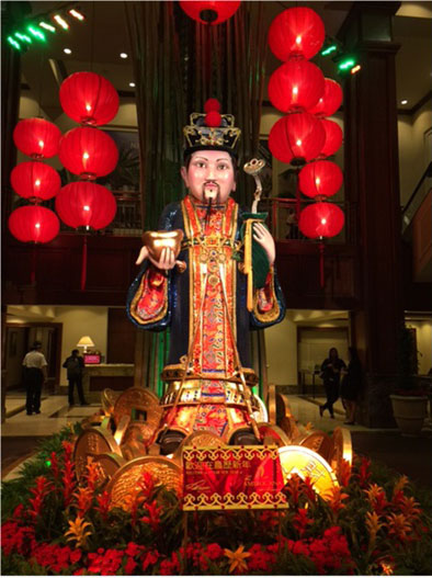 เมื่อไม่กี่ปีที่ผ่านมานี้ ตรุษจีนที่อเมริกาก็จะมีฉลองกันแต่ในกลุ่มของชาวจีนที่รวมกันอยู่ในไชน่าทาวน์บ้าง ตามหัวเมืองต่างๆบ้าง มาในปีนี้ดูจะเริ่มคึกคักมากขึ้น ดูได้จากการที่ชาวอเมริกันได้นำตรุษจีนเข้าไปอยู่ในเรื่องของธุรกิจมากขึ้น มีการยิงกลุ่มเป้าหมายชาวเอเชียน อย่างที่เห็นได้ชัดก็คือ ภาพที่ผู้เขียนถ่ายมานี้คือเทพเจ้าแห่งโชคลาภ ไฉ่ซิงเอี้ย ซึ่งสร้างเป็นตุ๊กตาสูงใหญ่เท่ากับตึก ๒ ชั้นยืนเด่นเป็นสง่าที่ล็อบบี้ของห้างอเมริกาน่า