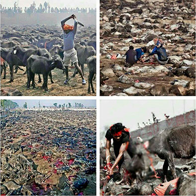 อย่างไรก็ตามผู้เขียนได้เห็นมีผู้ที่โพสท์ลงทางสื่อเน็ทเวิร์คเรื่องของเหตุสลดใจที่เกิดขึ้นในเนปาลเมื่อ ๕ เดือนก่อนเกิดเหตุแผ่นดินไหว คือที่เมืองปาริยะปุระ เขตชายแดนเนปาล ต่อกับอินเดีย ชาวบ้านทั้งหมู่บ้านและที่ต่างๆที่นับถือเจ้าแม่กาธิมัย เทพเจ้าฮินดู ได้หลั่งไหลกันมากว่า ๒ ล้านคน จากประชากรประเทศเนปาล ๒๘ ล้านคน มีการประกอบพิธีกรรมบูชายัญเจ้าแม่กาธิมัยที่จัดขึ้นทุกๆ ๕ ปี โดยวิธีฆ่าสัตว์ วัว ควาย แพะ หรืแม้แต่หนูด้วยวิธีการฟันคอจนตาย ๕ แสนตัว กลิ่นเลือดคละคลุ้งไปทั้งหมู่บ้าน