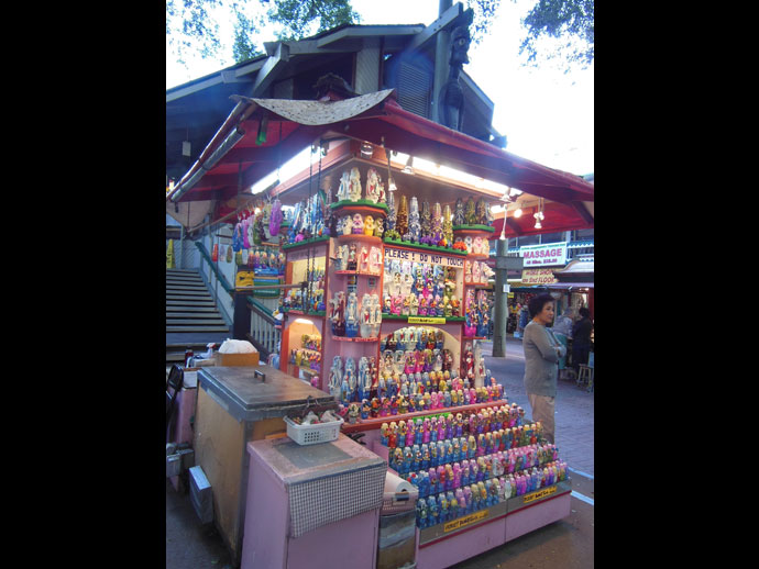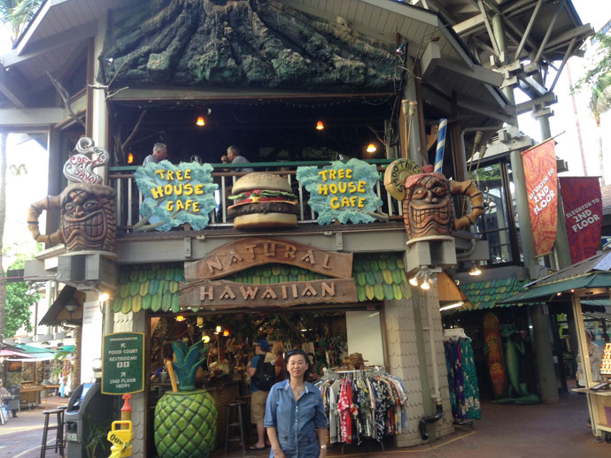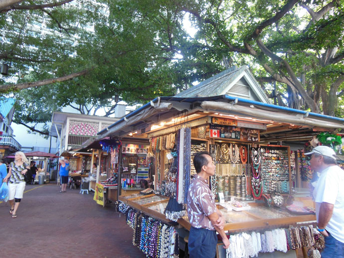 ด้านหลังโรมแรม Aqua Waikiki Wave ที่ผมพัก ระหว่างถนน Kuhio และถนน Kalakaua มีร้านขายของเป็นซุ้มคล้ายถนนคนเดินที่กำลังเป็นที่นิยมที่เมืองไทย เรียกว่า International Market ขายของที่ระลึกที่น่าสนใจมากมายหลายหลาก มีเสื้อผ้า เครื่องประดับประเภทสร้อยแหวน ของเก่าของใหม่มากมายมีให้เลือก ผมชอบใจพวกป้ายโฆษณาเก่าๆ ที่เป็นโปสเตอร์เพ้นติ้งบนแผ่นสังกะสี มี Elvis Presley, Marilyn Monroe, Coca Cola, Pepsi, Seven Up, Gas Station, ของพวกนี้เอามาปรับตกแต่งร้านให้ดูคลาสิก หรือแขวนในห้องน้ำก็ดูดี ผมตั้งใจจะซื้อหา แต่พอนึกถึงน้ำหนักตอนขึ้นเครื่องบินก็ต้องถอดใจ