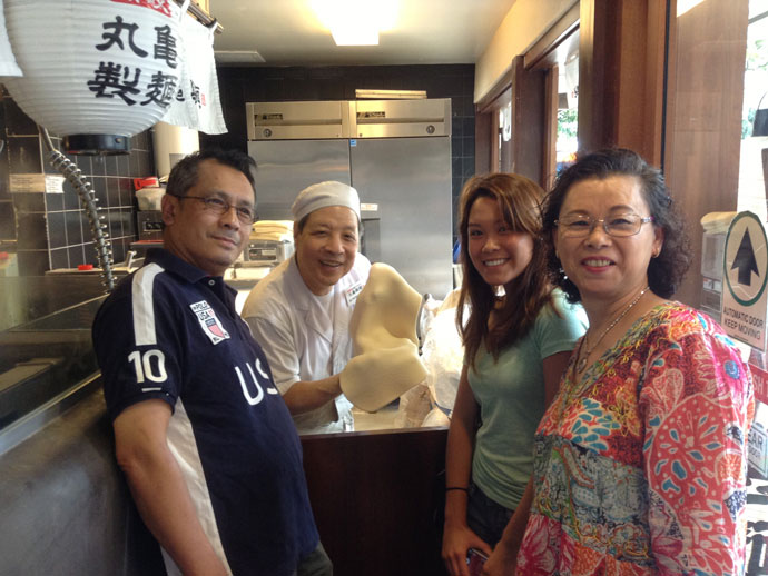 เริ่มตั้งแต่ด่านแรกเลยครับพี่น้อง เขาทำเส้นอุด่งกันสดๆ เริ่มตั้งแต่คนนวดแป้ง เอาเข้าเครื่องตัดออกมาเป็นเส้นแล้วส่งต่อให้คนลวกเส้น คนลวกเสร็จเทลงอ่างน้ำเย็น อีกคนจับเส้นเหมือนจับขนมจีนพอสะเด็ดน้ำใส่ถ้วยตวงคว่ำไว้ในถาดเป็นชุด ๆ คราวนี้ก็ถึงคิวเราออเดอร์ละครับ มีป้ายพร้อมภาพอาหารประกอบบอกราคาไว้เสร็จสรรพ ชามเล็ก $3.95 กลาง $5.95 ใหญ่ $7.95 น้ำซุปมีรสเนื้อ ไก่ หมู เจ (มังสะวิรัต) และ Curry น่าจะเป็นแกงกะหรี่ ผมนึกใจว่า ก็ราคามันถูกยังงี้ไงเล่า ลูกค้าถึงได้เข้าคิวรอกันยาวเหยียดออกมานอกร้าน ผมกับแม่บ้านสั่งอุด่งน้ำซุปไก่ถ้วยกลาง ลูกสาวสั่งซุปเนื้อถ้วยกลางเหมือนกัน อุแม่เจ้า..มีแต่เส้นครับ ไม่มีเนื้อไก่สักชิ้น ผมขอตั้งชื่อว่า “ร้านกินเส้น” เราก็ถือถาดใส่ชามอุด่งเดินไปต่ออีกยังไม่หมดรายการครับ ยังมีเครื่องเคียงไว้แจมอีก เป็นของทอดประเภทเทมปูระ มีกุ้ง มีผัก มีข้าวห่อ ผมหยิบผักมาชิ้นหนึ่ง $1.00 ข้าวห่อสาหร่ายปลาแซลม่อน $1.50 น้ำเปล่าไม่ชาร์จ ได้ของกันครบกะว่าพออิ่มก็ไปจ่ายเงิน บวกภาษีเบ็ดเสร็จแล้วออกมาประมาณว่าหัวละ $10.00 หาที่นั่งเอาเอง โต๊ะที่นั่งและบูธเต็มไปหมด มีบาร์ว่างอยู่เราเลยจองกัน บนข้างฝามีข้อความพิมพ์แปะไว้บอกลูกค้าว่า No Tip Require ผมไม่สนแล้วเพราะอยากจะซดอุด่งใจจะขาด กลิ่นมันหอมหวนยวนใจจริงๆ ค่อยๆ บรรจงช้อนน้ำซุปเข้าปาก อุแม่เจ้า ว้าว !! รสชาติกลมกล่อมได้อารมณ์ไม่ต้องผสมเครื่องปรุงอีกเลย โซ้ย..อุด่งควบคู่กับเทมปูระผักรวดเดียวจบ อร่อยจนหยดสุดท้าย ตบท้ายด้วยข้าวห่อสาหร่ายปลาแซลม่อน โถ..แม่เจ้าประคุณ กัดได้สองคำก็เรียบร้อยแล้ว มองไปที่สองคนแม่ลูกกำลังเอร็ดอร่อยเช่นกัน หัวละ $10.00 อย่างต่ำ แพงไหมๆ สำหรับผมพอรู้รสชาติแล้วไม่แพงเลย ถ้าไม่อิ่มก็สั่งชามใหญ่และหยิบเครื่องเคียงเพิ่ม
